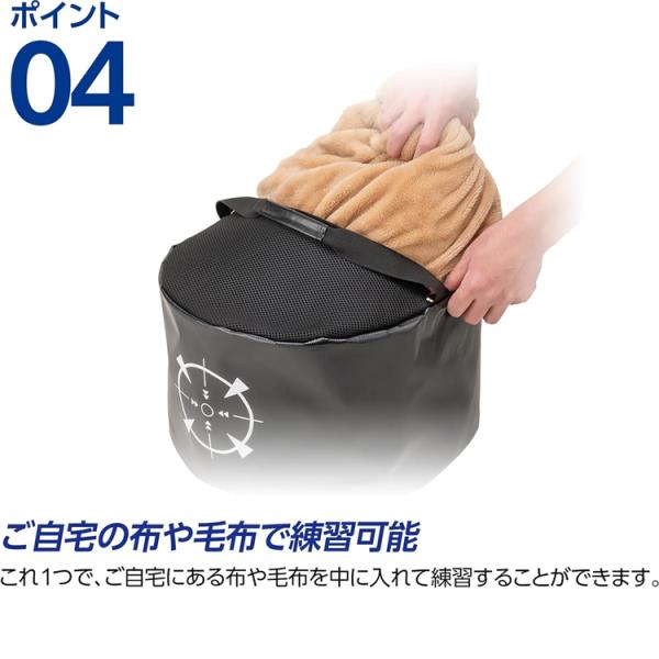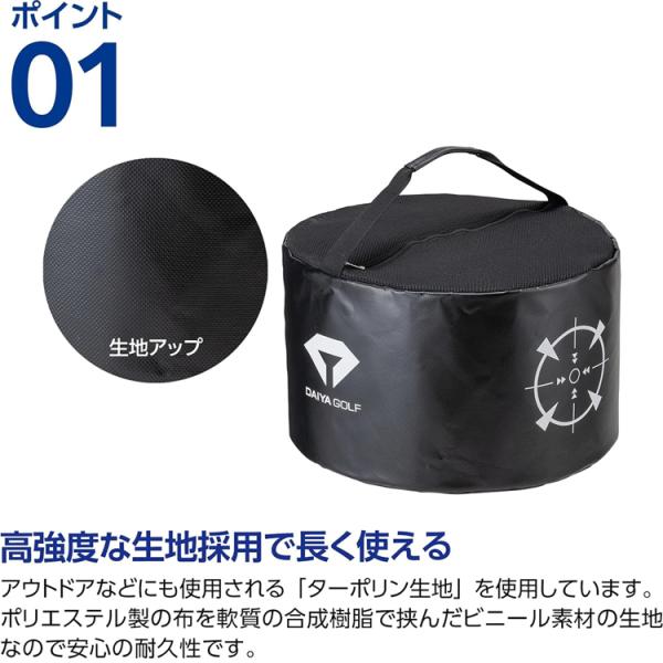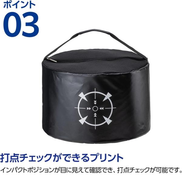 『ダイヤインパクトバック』に印刷されている的を叩くことで、インパクト時の力の入れ方を体感できます。バッグの中はインパクトの衝撃で多少動く程度の重さ(3kg)で中身を詰めます。叩いた瞬間に力が集中できているとバッグが動いたり、インパクトの時に力が分散しているスイングの時と、正しい位置で手首のリリースができている時の音の響き方の違いが分かります。