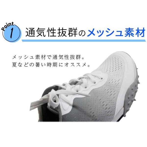 グラデーションが爽快なイメージを与えるスポーティーなデザイン。スタイリッシュな印象を与えるブラックカラーもあります。メッシュ素材で通気性抜群。夏などの暑い時期にオススメ。スパイクレスなのでコンクリートなどの歩道も歩きやすい。軽い素材でできているので動きも快適に。ゴルフだけでなく普段使いにも活躍する一足。明治6年創業、地下足袋発祥の地、久留米で生まれたシューズメーカー。地下足袋の誕生からゴム産業の発展により栄えた久留米で、140年以上の長い月日ひたむきに靴を作り続けてきたムーンスター。そのムーンスターが手掛けるゴルフシューズ。