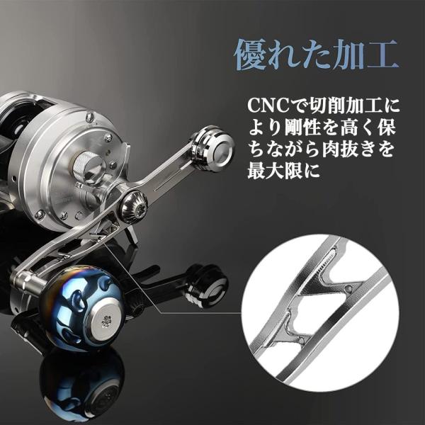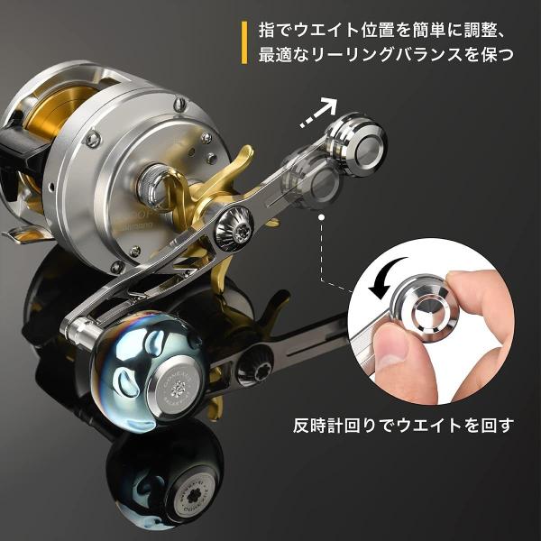 【稼働式バランサー】指で簡単にウエイトを調整し、最適なパランス位置を把握、巻き取りに時のグリップ位置による勝手な回転を制御。バランサーハンドルのため、回転が安定し、ジギングやディープタイラバなどの激しいファイトにも巻き心地よく巻き上げる。