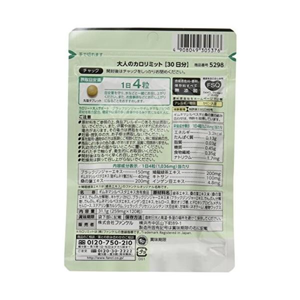 「商品情報」カロリミットシリーズは、食べることを楽しみたい方や、ダイエット中の方におすすめのサプリメントです。 お食事の時にサッと4粒。毎日の食事をおいしく食べるための新習慣に。 「大人のカロリミット」だけの注目成分「ブラックジンジャー」配合。 タイで古くから食されてきたハーブ。 年齢と共に低下するタイシャリズムに幅広くアプローチする期待のダイエット成分としてファンケルが注目。 ※効果には個人差があります。健康的なダイエットには適切な食生活と運動が必要です。「主な仕様」気になるお食事の時に1日1回。