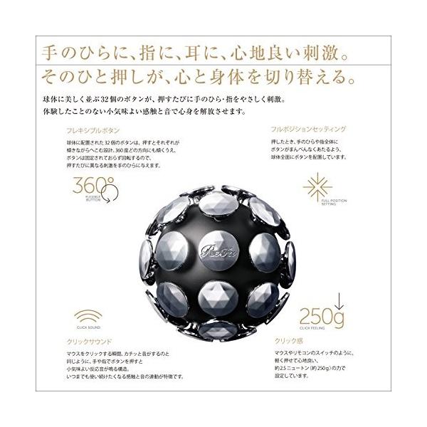 「商品情報」球体に並ぶ32個のボタンが、押すたびに手のひらや指を優しく刺激します。球体に美しく並ぶ32個のボタンが、押すたびに手のひら・指をやさしく刺激。体験したことのない小気味よい感触と音で心身を解放させます。【特長】・球体に配置された32個のボタンは、押すとそれぞれが傾きながらへこむ設計。・360度どの方向にも傾くうえ、ボタンは固定されておらず回転するので、 押すたびに異なる刺激を手のひらに与えます。・カチッと音がするのと同じように、手や指でボタンを押すと小気味よい反応音が鳴る構造。 いつまでも使い続けたくなる感触と音の連動が特徴です。・マウスやリモコンのスイッチのように、軽く押せて心地良い、 約2.5ニュートン(約250g)の力で設定されています。「主な仕様」原産国:日本