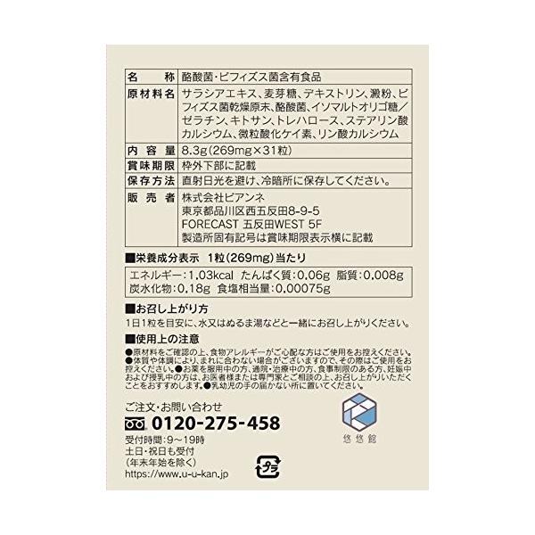 「商品情報」【確かな品質で安心安全】 厚生労働省で定められた厳しいガイドラインをクリアしたGMPに準拠した工場で 作られています。 【内容量】 1袋31粒入り/約1ヵ月分 【原材料名】 サラシアエキス、麦芽糖、デキストリン、澱粉、ビフィズス菌乾燥原末、 酪酸菌、イソマルトオリゴ糖、ゼラチン、キトサン、トレハロース、ステアリン酸カルシウム、 微粒酸化ケイ素、リン酸カルシウム 【栄養成分表示/1粒(269mg)あたり】 エネルギー・・・1.03kcal たんぱく質・・・0.06g 脂質・・・・・・0.008g 炭水化物・・・・0.18g 食塩相当量・・・0.00075g 【お召し上がり方】 1日1粒を目安に、水またはぬるま湯などとお召し上がりください。 【飲むタイミング】 健康食品ですので決まりはありませんが、食事の際(食前・食後どちらでもOKです)に お召し上がりいただくのをオススメしております。「主な仕様」