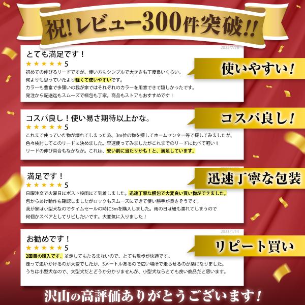 長さ:3m(体重約10kgまでの小型犬向け)/5m(体重約15kgまでの大型犬向け)