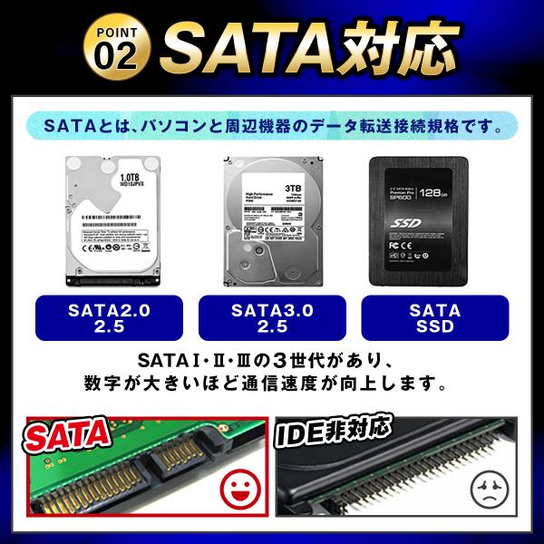 2.5インチSATAインターフェイス(厚さ9.5mm以下)に対応しており、USB 3.0の出力インターフェイスを備えています。