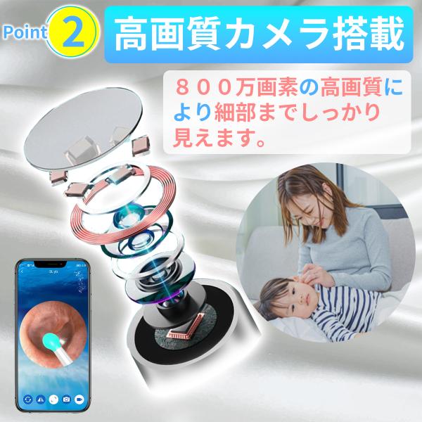 耳かき先端には800万画素カメラと6つのLEDライトが搭載されており、超高精細で明るい映像を提供。一人でも簡単・安全な耳掃除が可能です。