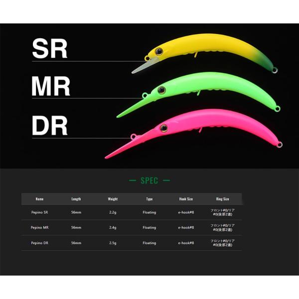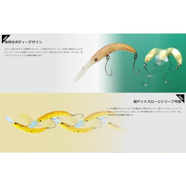 超ハイプレッシャー対応の極細スリムシェイプミノー! ハイプレッシャーな状況下で使用されることを想定しボディのシェイプを極限まで細くして、追尾してくる魚からの視点で見えるシルエットを可能な限りコンパクトに。ボディを細くすることによって生じるアクションレスポンスの低下はアイの位置やウェイト配置などのテストを繰り返し行い克服。超デッドスローでもワイドにアクションするハイバランス設計。