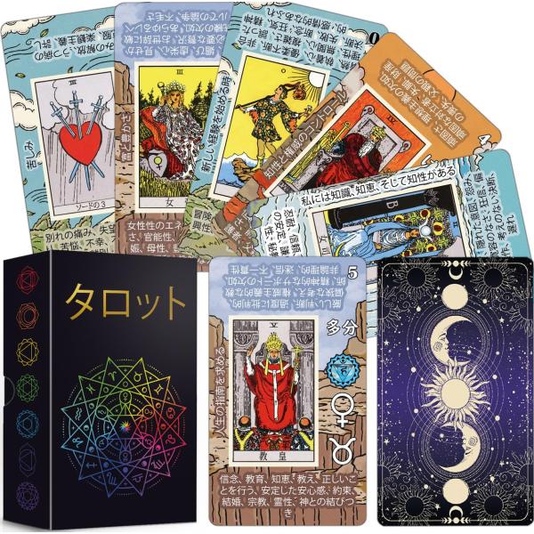 詳細に注意を払って作成されたタロットカード:各カードに異なる背景があり、それぞれのカードが風、火、水、土の要素に対応しています。さらに、裏面はカードの読み方に影響を与えないように、両側で対称的なデザインになっています。