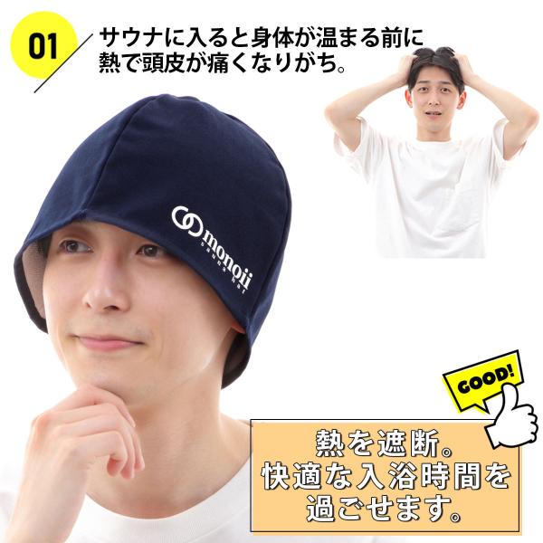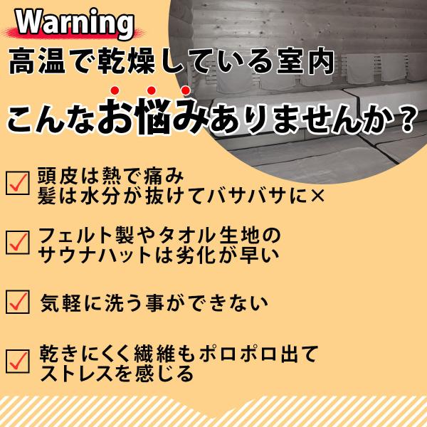 【 頭皮へのダメージを防止 】高温になるサウナ室で、熱さで痛くなってしまう頭へのダメージを軽減します。