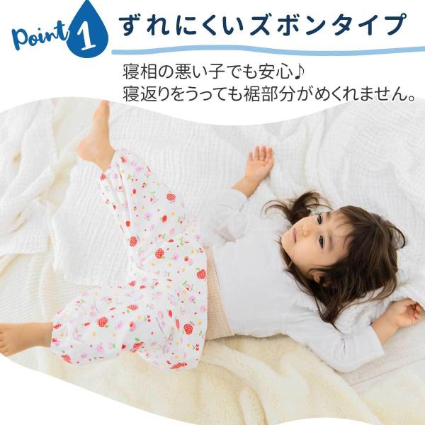 【 寝相が悪くても安心 】寝相の悪い子でも安心♪ずれにくいスボンタイプで、寝返りをうっても裾部分がめくれたりする心配がありません。