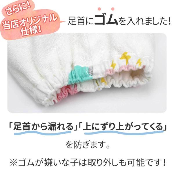 【 お腹をしっかりガード 】お腹や腰を冷やさない腹巻付きです。ウエスト部分は柔らかで伸びのよい総ゴム仕様で、優しい履き心地です。履かせやすく、お着替えも楽チンなパンツです。