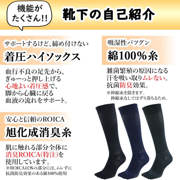 吸水性に優れた綿100%糸と、消臭・抗菌・防臭の効果がある旭化成消臭ROICAを使用した着圧ソックスです。