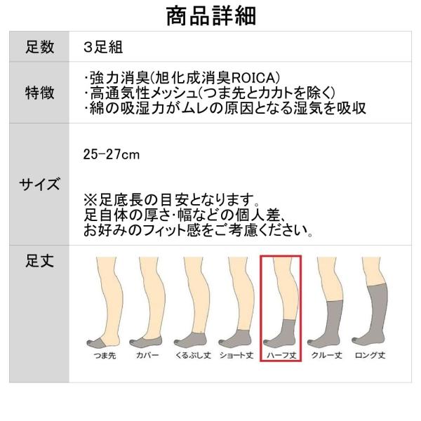 旭化成社製の消臭ROICAを肌にふれる部分に、それ以外には吸汗性に優れた綿100%糸をたっぷり使用しています。足のニオイにお悩みの方はぜひお試しを!!