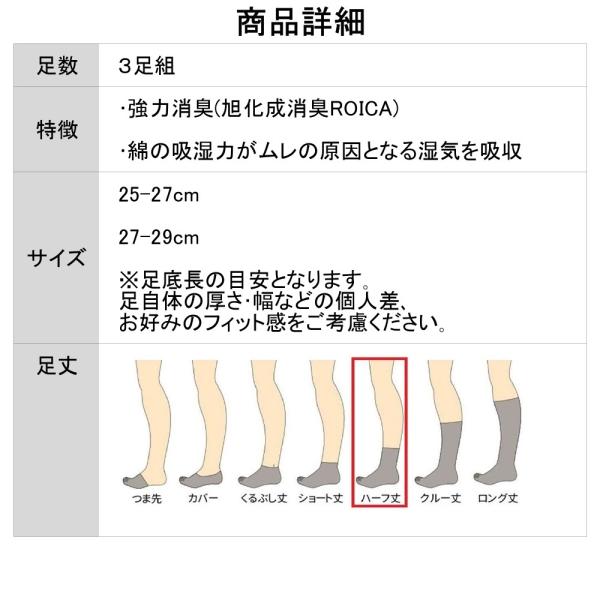 旭化成社製の消臭ROICAを肌にふれる部分に、それ以外には吸汗性に優れた綿100%糸をたっぷり使用しています。足のニオイにお悩みの方はぜひお試しを!!