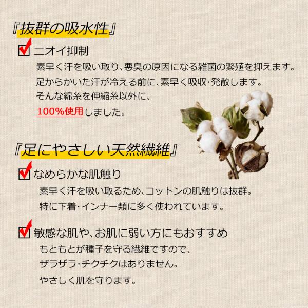 吸水性に優れ、消臭・抗菌・防臭の効果がある綿100%の5本指靴下です(伸縮糸を除く)。肌に触れた柔らかい感覚も綿100%独特の魅力です。是非お試しを!!