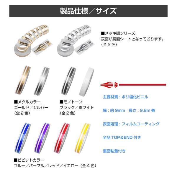商品名:9mm幅 ピンストライプステッカー トップエンドセット 9.8m巻 全10カラー