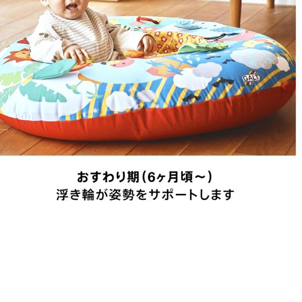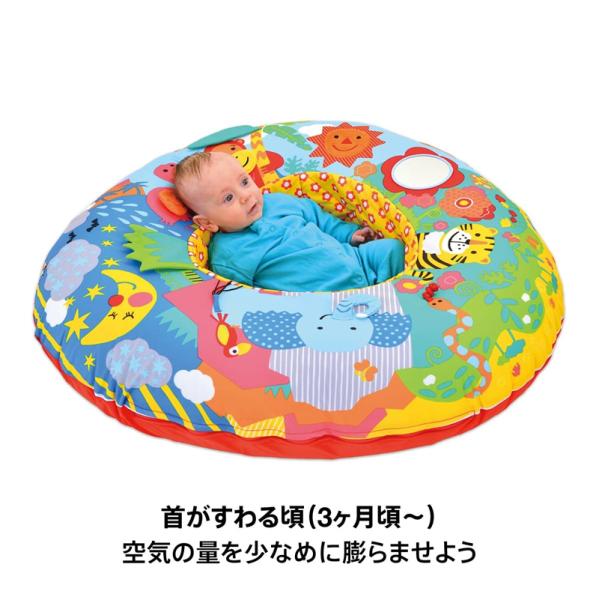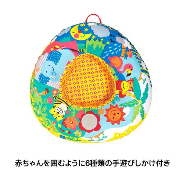 BorneLund(ボーネルンド ).GALT社 ベビー・プレイネスト ポンプ付 です。 浮き輪型のまるいチューブをふくらませて使用します。 まるで大切な赤ちゃんを守る小鳥の巣のようなプレイネストです。 低月齢の赤ちゃんの場合は、枕としても使用できるようにチューブの中の空気を少なめに、おすわりの練習やハイハイの時期には空気を多めに入れて使います。 安定感があるので、寝返り、お座りが安定しないころにも安心です。 周りの動物のイラストには触ったり、音が鳴ったりと、楽しいしかけがぐるりと赤ちゃんを囲みます。 家事の途中で、赤ちゃんを目の届くところでねんねさせたい時、バウンサーのようにゆらゆらと動かしたいときなど、 目を覚ましているときの赤ちゃんの快適な居場所として活躍します。