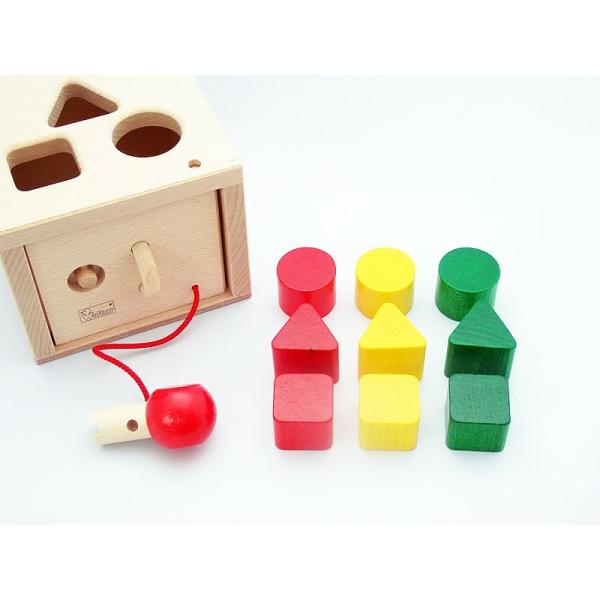 子供の大好きな鍵の開け閉めと、型はめ遊びが楽しめます。ブロックの形は3種類、各色3色ずつ、合計9個のブロックが付属しています。最初は扉を開けたり閉めたり、ブロックを出したり入れたりを繰り返し遊びます。ちょっとずつ穴にブロックを入れることを教えてあげると、遊びの幅も広がります。