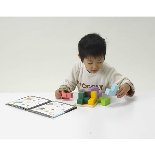 カラフルな7つのブロックで木製プレートの上に立方体を組み立てます。 56種類のパターンを掲載したテキストブックを参考に、柔軟に頭を使いましょう! 上級レベルは大人でも頭を抱えるほど難易度が高く、夢中で遊ぶうちに脳が活性化されます。 立方体が完成したときの満足感が繰り返しチャレンジする意欲を引き出し、忍耐力と集中力を養います。