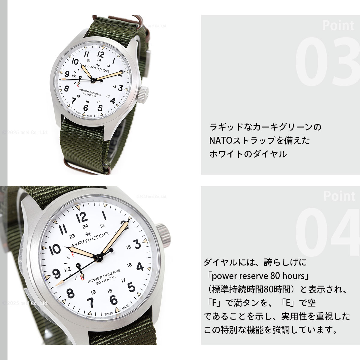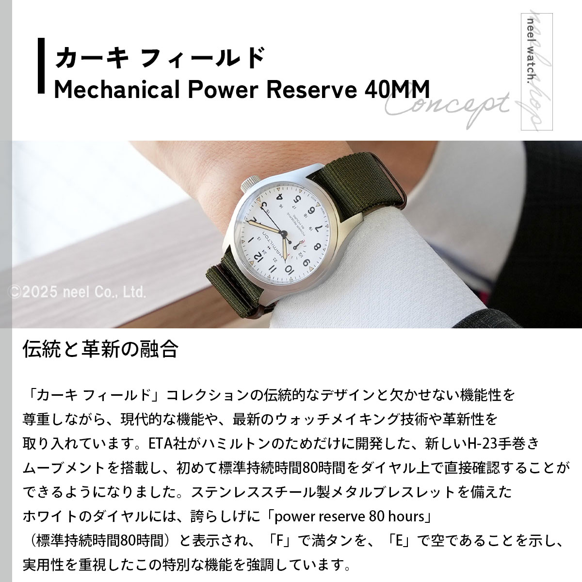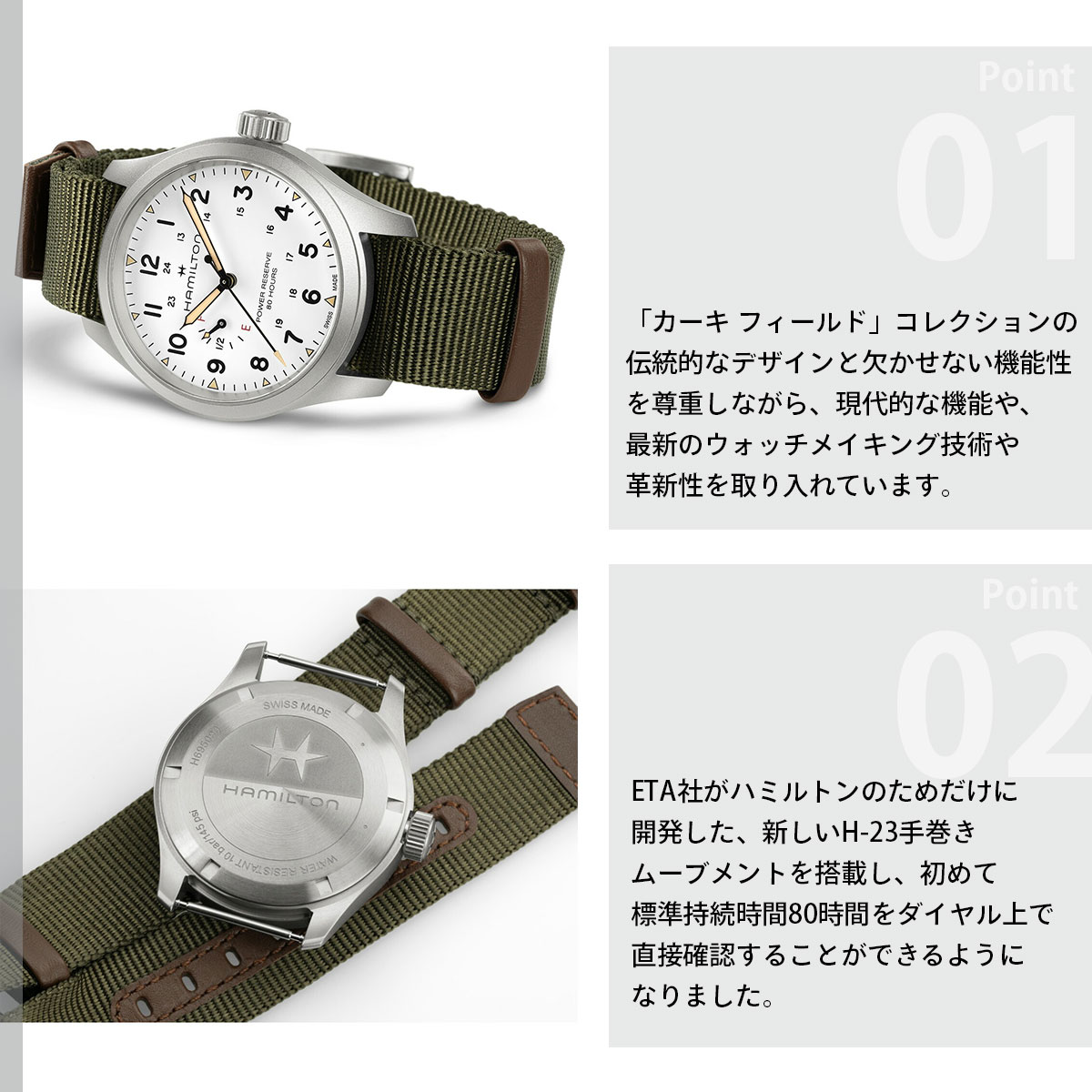 【ハミルトン HAMILTON カーキ フィールド メカニカル パワーリザーブ H69509910 腕時計 メンズ 手巻き 機械式 KHAKI FIELD MECHANICAL POWER RESERVE 「カーキ フィールド メカ パワーリザーブ」は、「カーキ フィールド」コレクションの伝統的なデザインと欠かせない機能性を尊重しながら、現代的な機能や、最新のウォッチメイキング技術や革新性を取り入れています。ETA社がハミルトンのためだけに開発した、新しいH-23手巻きムーブメントを搭載し、初めて標準持続時間80時間をダイヤル上で直接確認することができるようになりました。ラギッドなカーキグリーンのNATOストラップを備えたホワイトのダイヤルには、誇らしげに「power reserve 80 hours」(標準持続時間80時間)と表示され、「F」で満タンを、「E」で空であることを示し、実用性を重視したこの特別な機能を強調しています。[ハミルトン HAMILTON 2025 新作]】