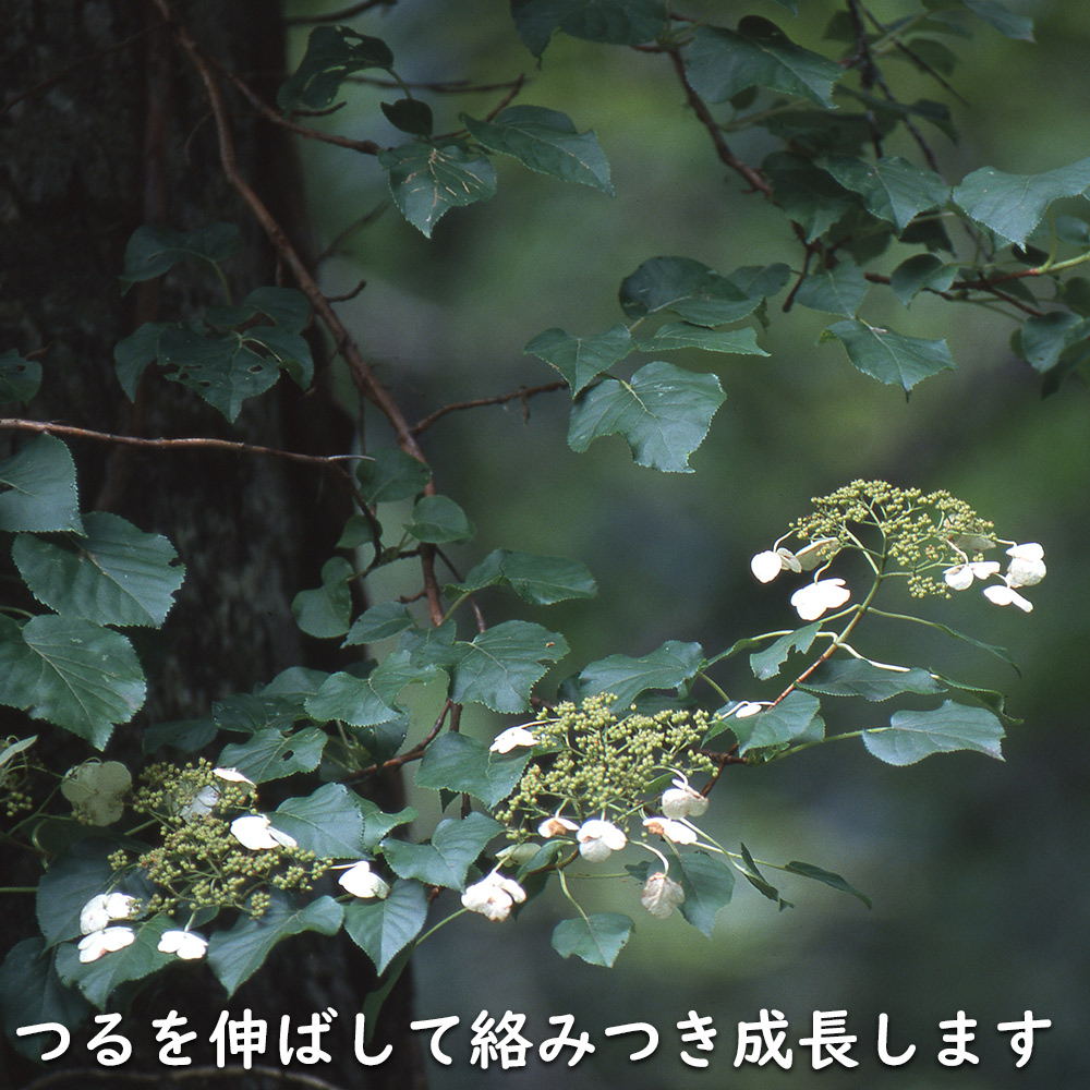 【ツルアジサイ】 読み:つるあじさい 学名: Hydrangea petiolaris アジサイ科アジサイ属 落葉つる性高木 【商品情報】 ツルアジサイはつる性の落葉品種です。吸着により成長します。山林の高木や岩に気根で吸着します。非常に大きく伸びます。初夏に白色の花が集まって咲きます。乾燥をと暑さを嫌います。冬場は落葉します。放任していても形状に合わせて形を整えます。
