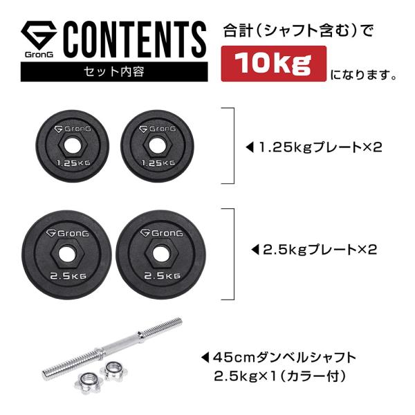 【5/1〜ポイント5%+最大600円OFFクーポン配布】グロング アイアンダンベル 10kg 片手 シャフト プレート セット 重量変更 調節可能 GronG 爆買