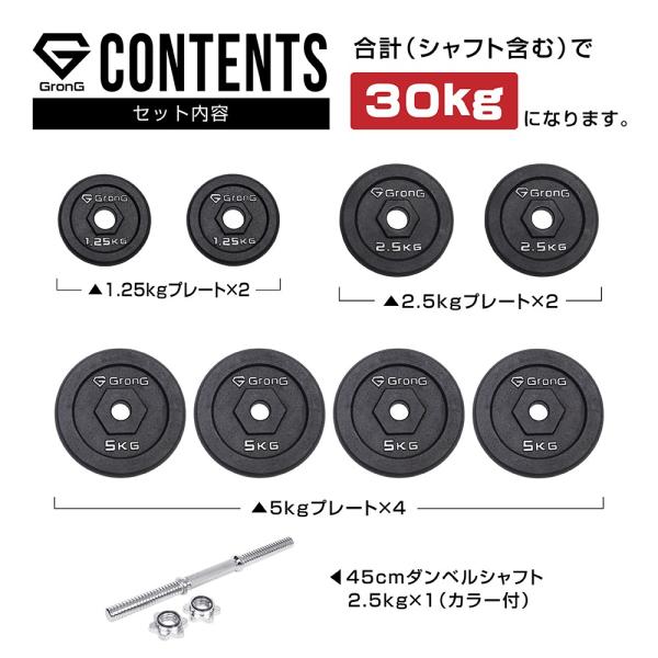 【5/1〜ポイント5%+最大600円OFFクーポン配布】グロング アイアンダンベル 30kg 片手 シャフト プレート セット 重量変更 調節可能 GronG 爆買