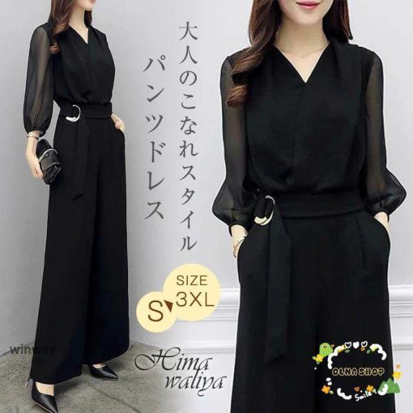 結婚式 パンツドレス ワイドレッグジャンプスーツ 服装 パーティードレス 20代 30代 袖あり 40代 女性 無地 シンプルなファッション