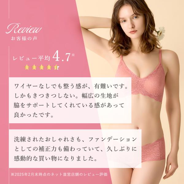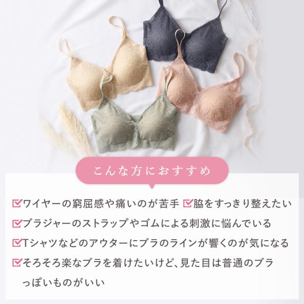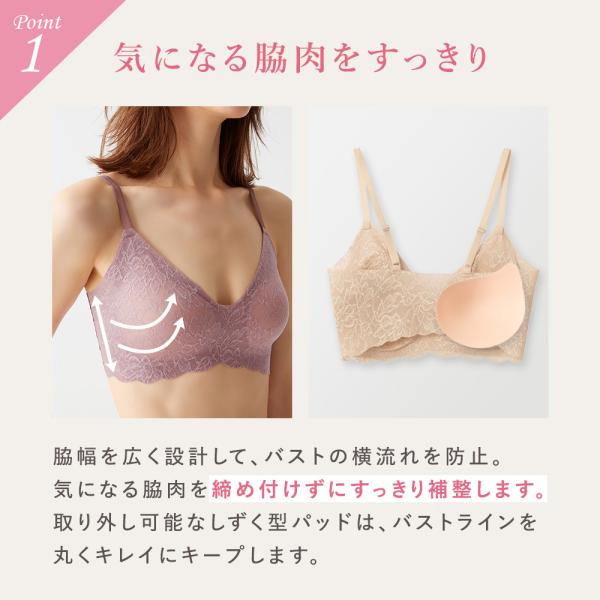 脇すっきり、胸の高さもキープしてくれるカットオフレースを使ったノンワイヤーブラ。