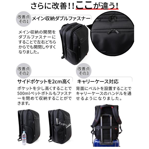 【3つの改善ポイント】(1)メイン収納ダブルファスナー (2)旧モデルのサイドポケットを2cm長くして最長部27cmにしました。500mmlペットボトル可※画像参照 (3)キャリーケース用ベルトを装備