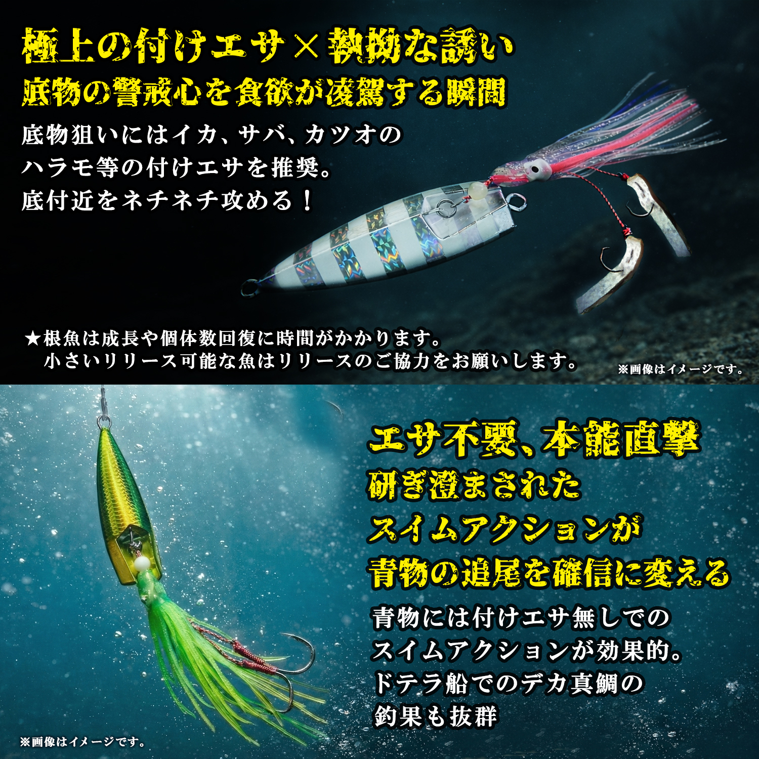 ◇青物には付けエサ無しでのスイムアクションが効果的。ドテラ船でのデカ真鯛の釣果も抜群。