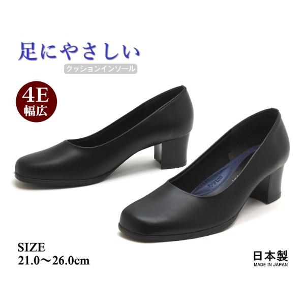 日本製 快適クッション 5cmヒール 4E 幅広 スクエアトゥ プレーンパンプス ブラック