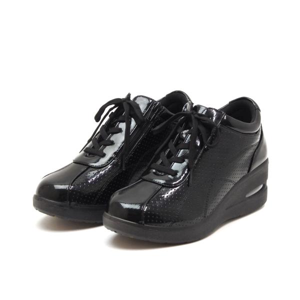 レディース 厚底エアーソール やわらか素材 レースアップスニーカー エナメル ブラック