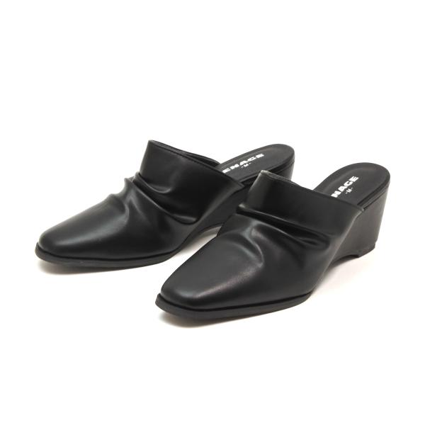 レディース シャーリング ミュール やわらか素材 スクエアトゥ ウェッジソール ブラック