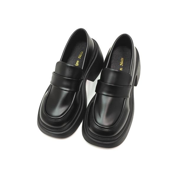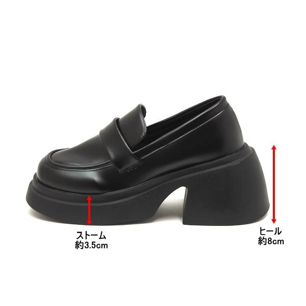 レディース 7cmヒール 厚底ローファー 美脚 ストーム 太ヒール スムースブラック