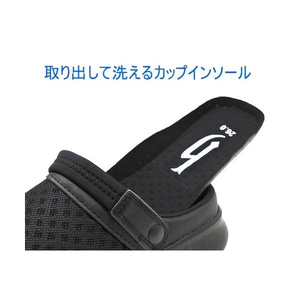 通気性のあるメッシュアッパー/取り出して洗えるカップインソール/すぽっと履けて脱ぎ履きが楽々/スリッポン/ベルトを後ろにまわしてバックバンドになる2WAYストラップ/軽くて屈曲性のあるアウトソール/オールブラック
