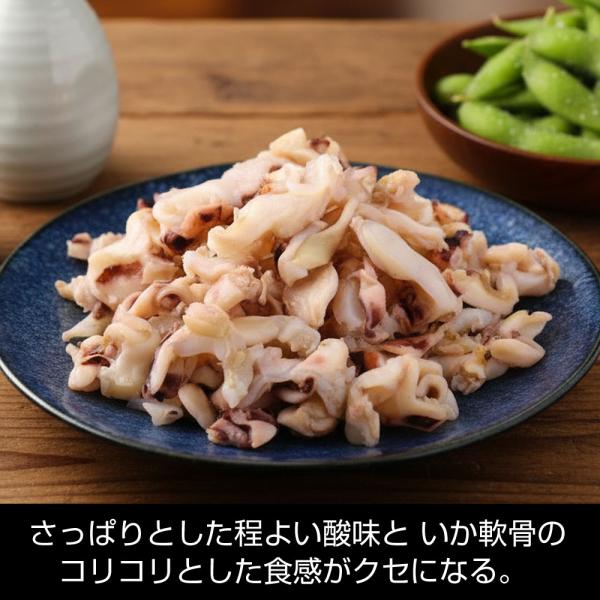 さっぱりとした程よい酸味と いかなんこつのコリコリとした食感がクセになる。