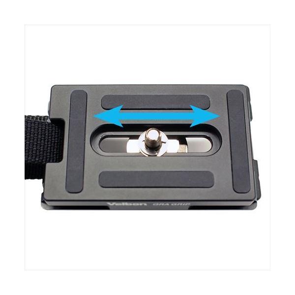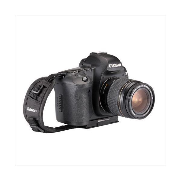 ハンドストラップ付きのクイックシュープレート。カメラのホールド感を高め、そのまま互換クイックシューのかわりに三脚へ取り付けることができます。