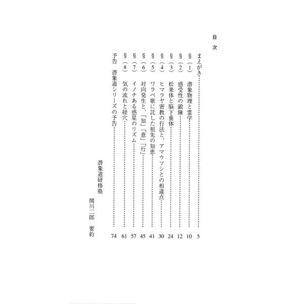 (目次より)1.潜象物理と霊学 2.感受性の鍛錬 3.松果体と脳下垂体 4.ヒマラヤ密教の行法と アマウツシとの相違点 5.ワラベ歌に託した祖先の知恵 6.対向発生と「知」「意」「行」 7.イノチある惑星のリズム 8.気の流れと経穴著:関川二郎