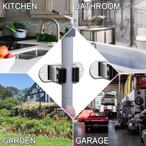 ■屋内外を問わず、この高耐久なモップホルダーは効果的にスペースを節約できます。キッチン、クローゼット、バスルーム、ガレージ、ユーティリティルーム、オフィスなど、さまざまな場所でご活用いただけます。