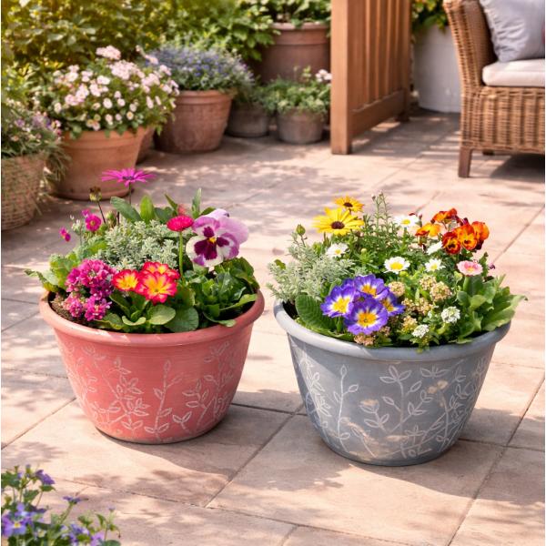 【送料無料(一部地域を除く)】季節の寄せ植え アンティーク柄 軽量プラスチック鉢 内径24cm 2鉢セット (鉢の色選択不可 )1鉢に6〜7種類