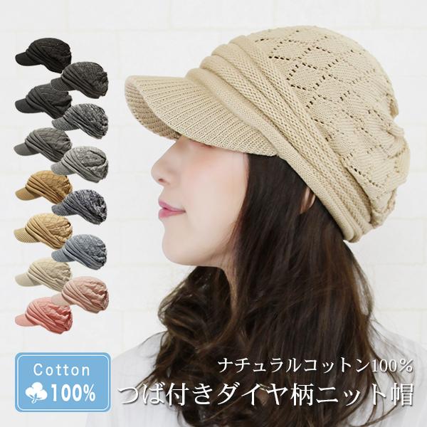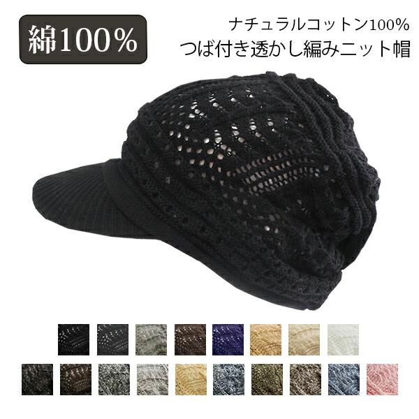 ニット帽 つば付き 春夏 レディース 医療用帽子 おしゃれ 可愛い キャスケット 大きめ 白髪 脱毛 綿 S M 帽子/コットン100%つば付透かし編みニット帽