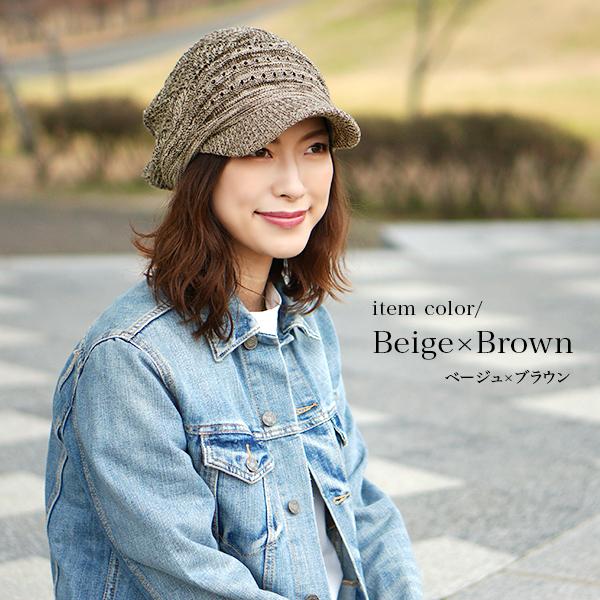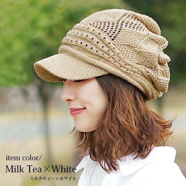 ニット帽 つば付き 春夏 レディース 医療用帽子 おしゃれ 可愛い キャスケット 大きめ 白髪 脱毛 綿 S M 帽子/コットン100%つば付透かし編みニット帽