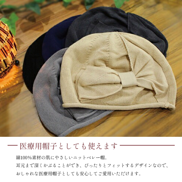医療用帽子 レディース シニア マダム おしゃれ 可愛い リボン ベレー帽 ギフト プレゼント 抗がん剤 ケア帽子/コットン100%リボンニットベレー帽