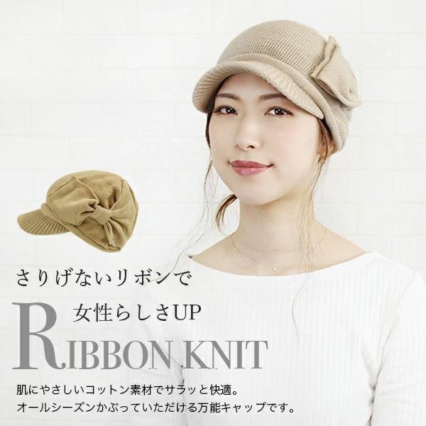 医療用帽子 春夏 レディース おしゃれ リボン ニット帽 可愛い キャスケット 抗がん剤 女性 ミセス 帽子/ナチュラルコットン100%つば付きリボンニット帽