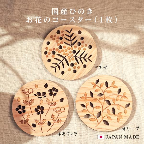 ひのきのコースター 花柄 ボタニカル ミモザ ネモフィラ オリーブ プレゼント ギフト 90mm 木製 木 手作り ヒノキ 檜 日本製 国産 敬老の日 母の日 父の日