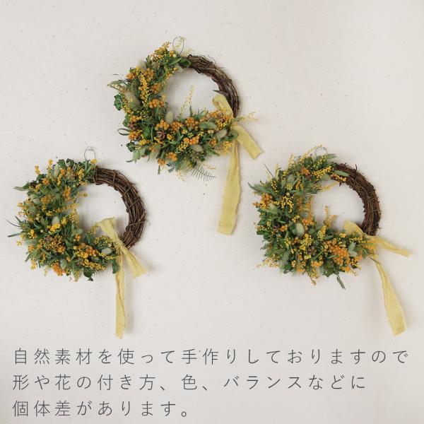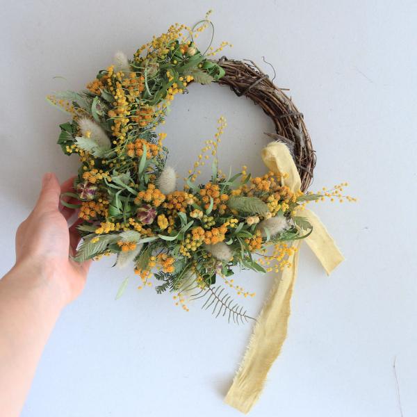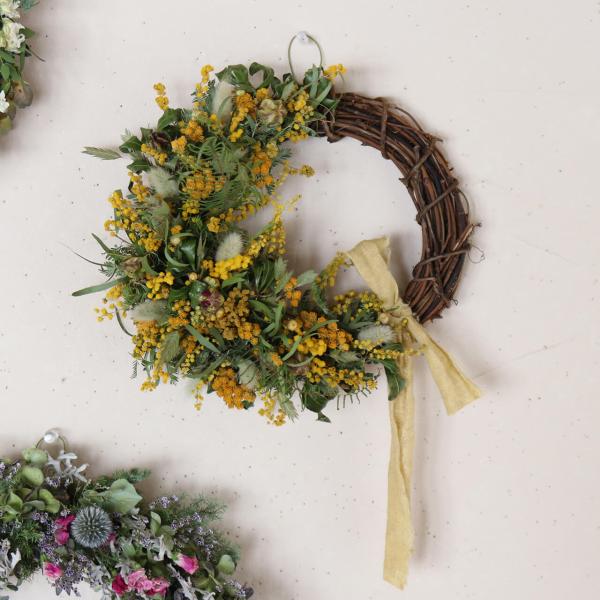 【 数量限定 】 ミモザとナチュラルグリーンのハーフムーンリース * ドライフラワー 母の日 ギフト 開店祝い プレゼント