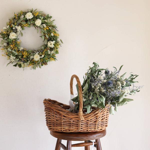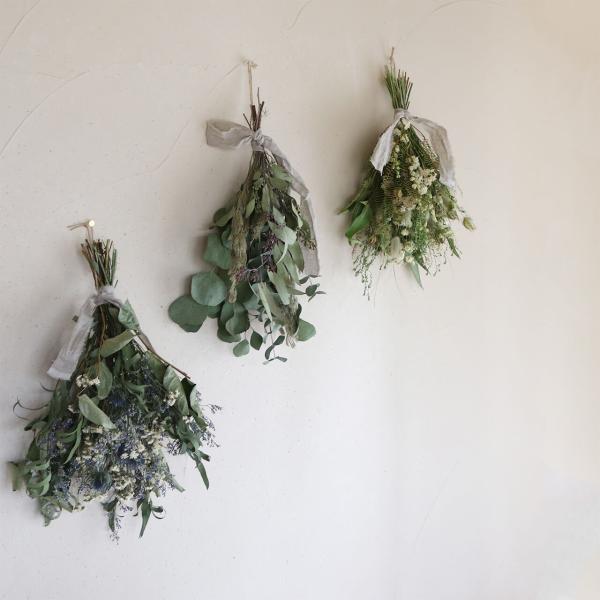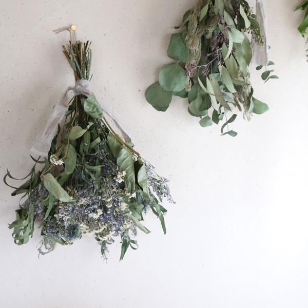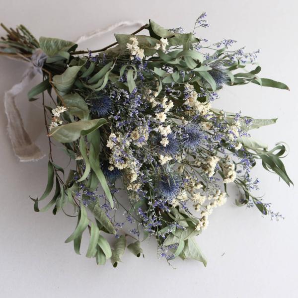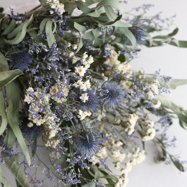 ブルーグリーンスワッグ ドライフラワー * エリンジュームのシックなブルーにユーカリのグリーン アキレアのキナリがアクセント