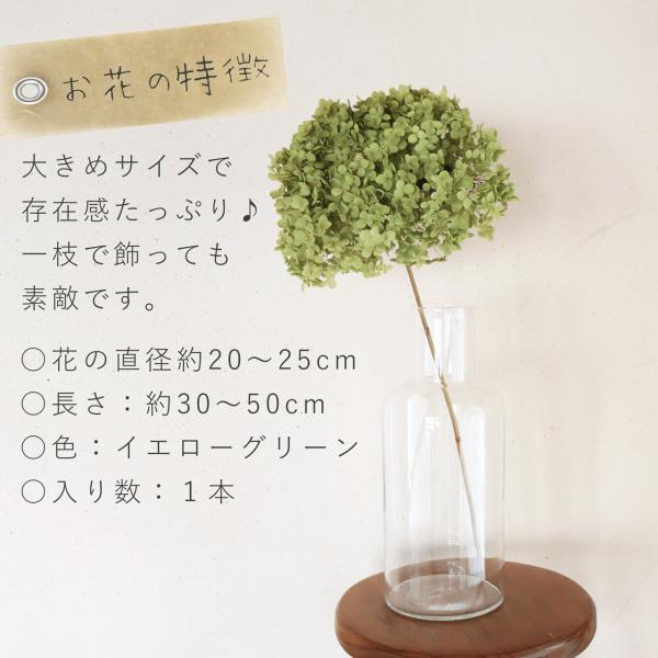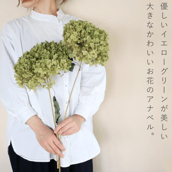 イエローグリーンの淡い色味で小さめのがくがふんわり集まったかわいいアナベルは通常のあじさい枝付きよりも優しげな印象。