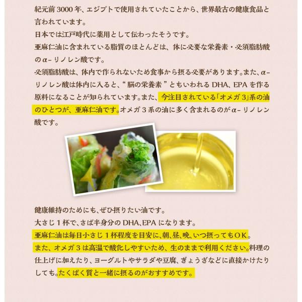 ・亜麻仁油(あまにゆ)は必須脂肪酸であるα−リノレン酸を豊富に含み、このα−リノレン酸が体内に入ることで、オメガ3脂肪酸(DHA/EPA)に変換され、頭をクリアにさせる効果が期待できることから"脳の栄養素"とも言われる健康油です。