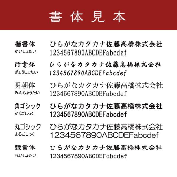 書体は「楷書」「行書」「明朝」「角ゴシック」「丸ゴシック」「隷書」よりお選びいただけます。
